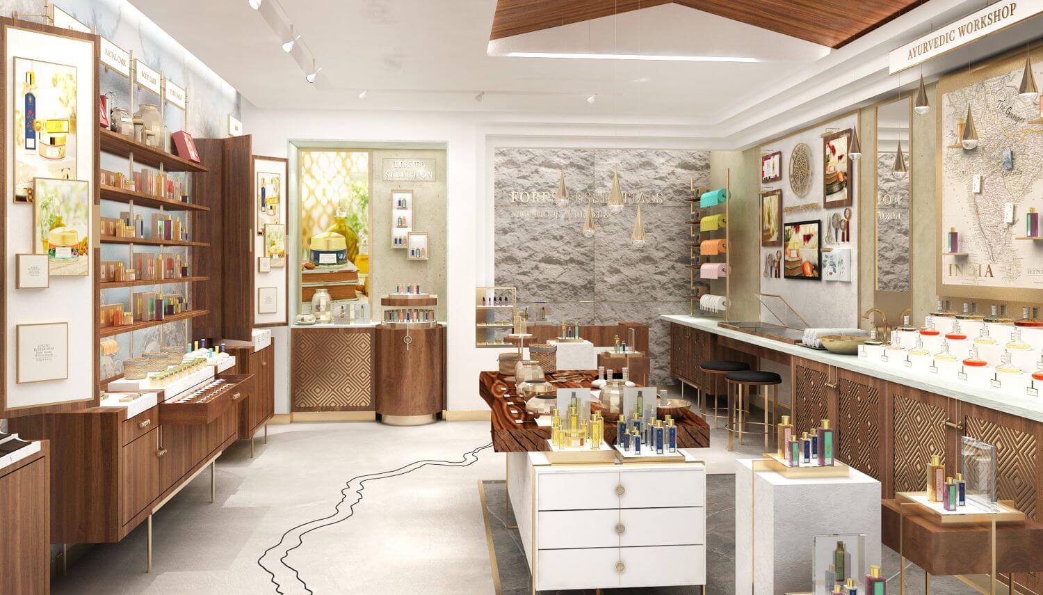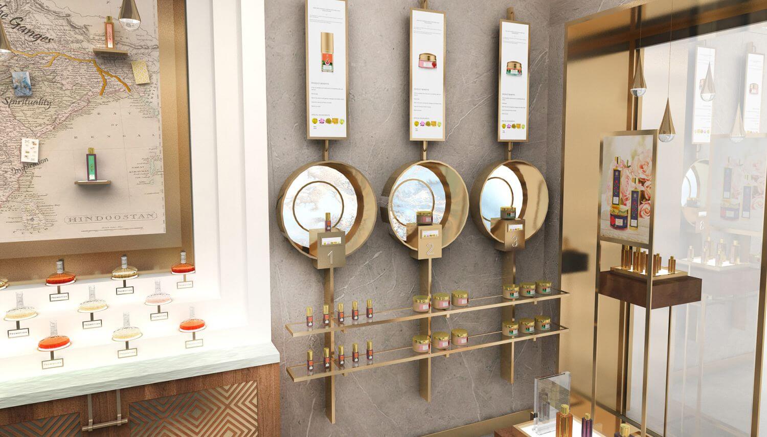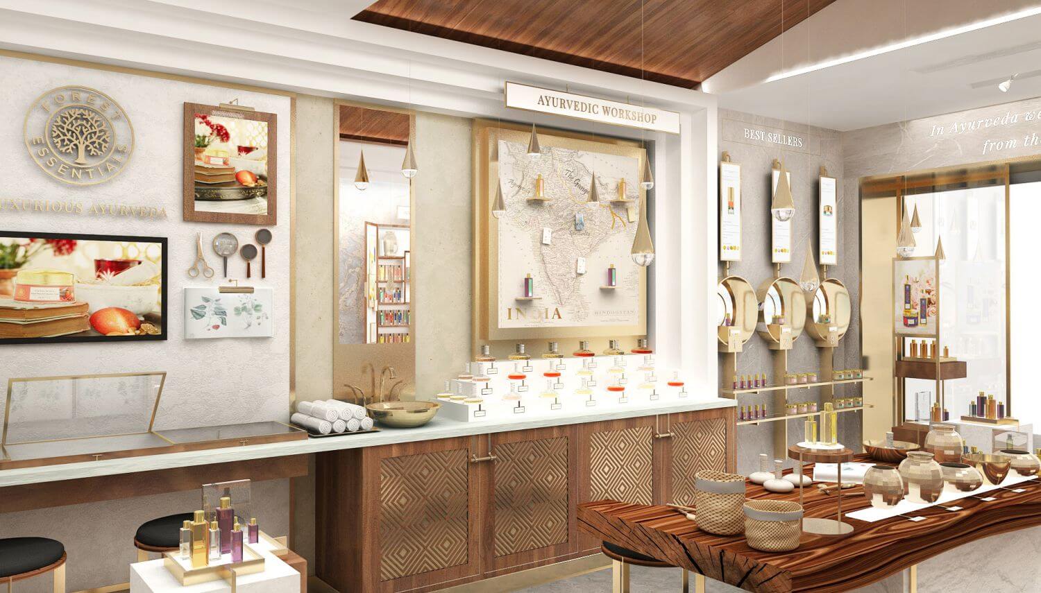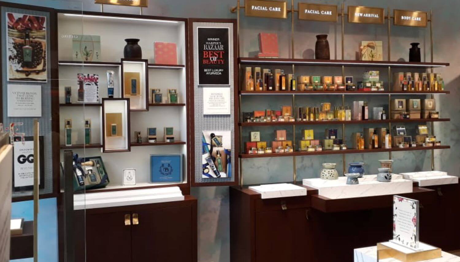 New concept store design is evolved from brand philosophy, and brings ancient bygone era and beautifully hand crafted elements. The Concept is one of its kind, where the customer experiences rich Indian culture of Ayurveda. Contrasted by modern sensibility and clean practical yet appealing layout, the result is a juxtaposition of contemporary and historic.